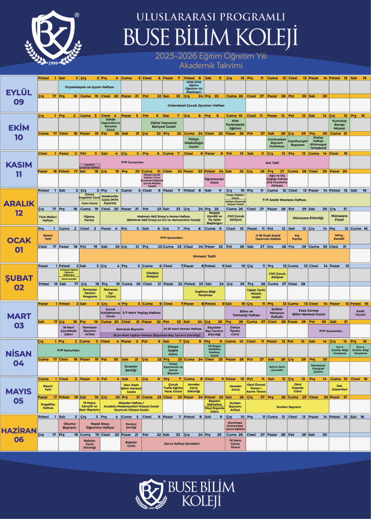 2025-2026 eğitim-öğretim yılı boyunca gerçekleştireceğimiz akademik, sosyal ve kültürel etkinliklerin yer aldığı Buse Bilim Koleji Akademik Takvimimizi sizlerle paylaşıyoruz. Takvimde, yıl boyunca planlanan tüm etkinliklerin tarihleri yer almaktadır. Bu sayede velilerimizin okul etkinliklerinden haberdar olması ve eğitim sürecine aktif biçimde katılım göstermesi hedeflenmiştir.